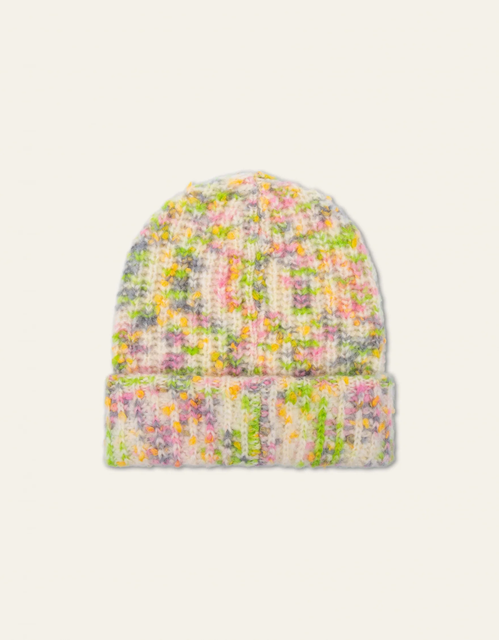 De speelse melange van kleuren en wolsoorten maken deze muts een gezellige, warme toevoeging aan je garderobe.