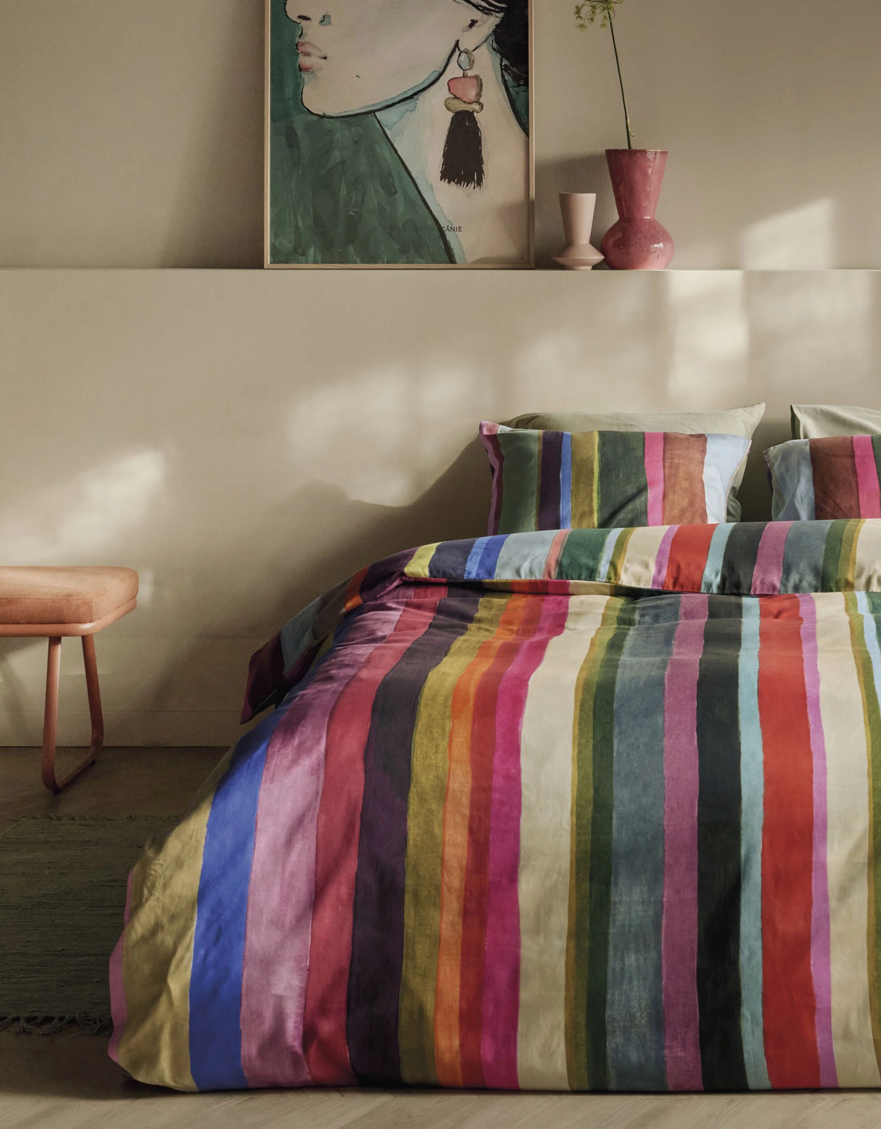 De Pieternella Stripe op dit dekbedovertrek brengt kleur en energie in je slaapkamer met grote, handgetekende strepen in contrasterende kleuren. De opvallende print is zowel trendy als stijlvol en geeft je bed een levendige uitstraling.