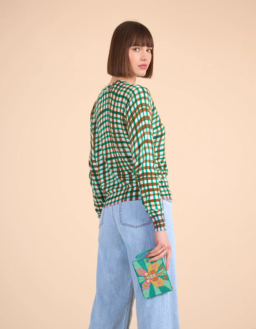 De voorkant van deze bijzodere Pelia Pouch is bedekt met kraaltjes, gelegd als een kleurrijke vlinder.